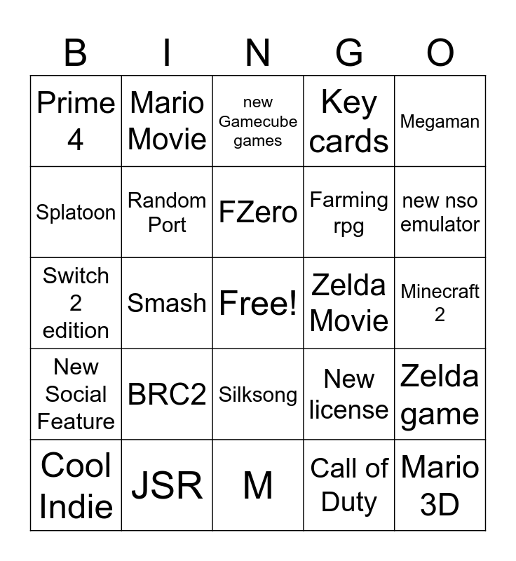 This bingo card has a free space and 24 words: BRC2, JSR, FZero, Cool Indie, Megaman, Prime 4, Splatoon, Mario Movie, Zelda Movie, Silksong, Farming rpg, Switch 2 edition, New license, Zelda game, Random Port, Call of Duty, Minecraft 2, new Gamecube games, new nso emulator, Smash, Mario 3D, New Social Feature, Key cards and M.