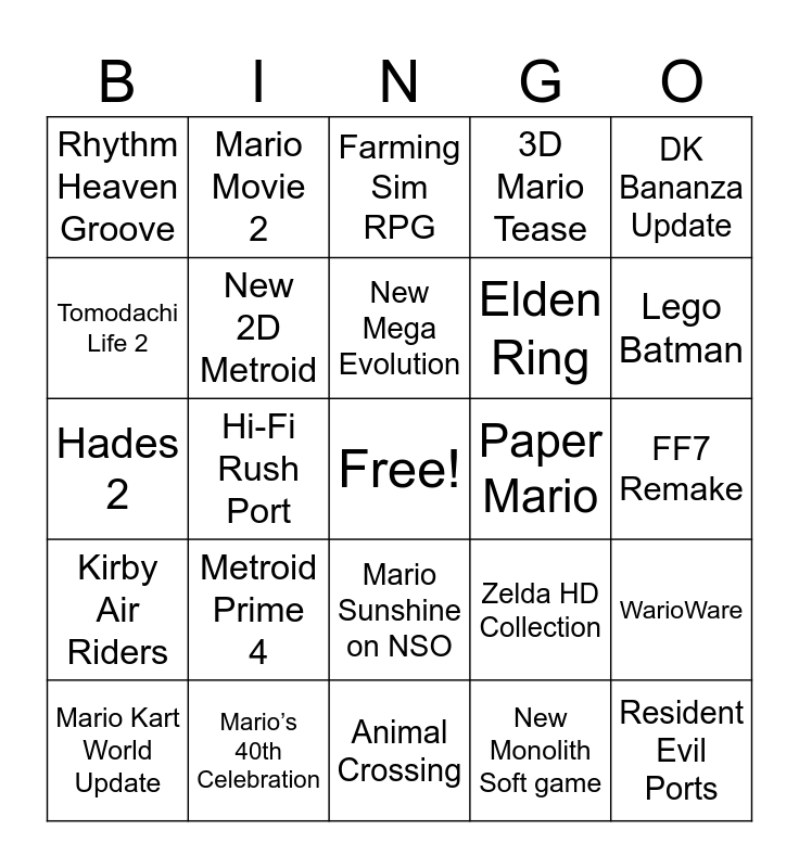 This bingo card has a free space and 24 words: Metroid Prime 4, Mario’s 40th Celebration, New Mega Evolution, Mario Kart World Update, DK Bananza Update, Rhythm Heaven Groove, Tomodachi Life 2, Mario Movie 2, Paper Mario, Mario Sunshine on NSO, Elden Ring, Hades 2, Zelda HD Collection, WarioWare, New 2D Metroid, New Monolith Soft game, FF7 Remake, Farming Sim RPG, Lego Batman, Hi-Fi Rush Port, Resident Evil Ports, Kirby Air Riders, 3D Mario Tease and Animal Crossing.
