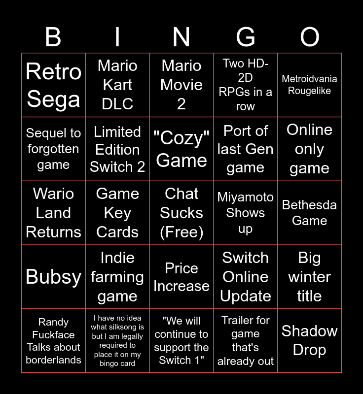 This bingo card has a free space and 24 words: Indie farming game, I have no idea what silksong is but I am legally required to place it on my bingo card, "Cozy" Game, Randy Fuckface Talks about borderlands, Metroidvania Rougelike, Retro Sega, Sequel to forgotten game, Mario Kart DLC, Miyamoto Shows up, Price Increase, Port of last Gen game, Wario Land Returns, Switch Online Update, Big winter title, Limited Edition Switch 2, Trailer for game that's already out, Bethesda Game, Mario Movie 2, Online only game, Game Key Cards, Shadow Drop, Bubsy, Two HD-2D RPGs in a row and "We will continue to support the Switch 1".