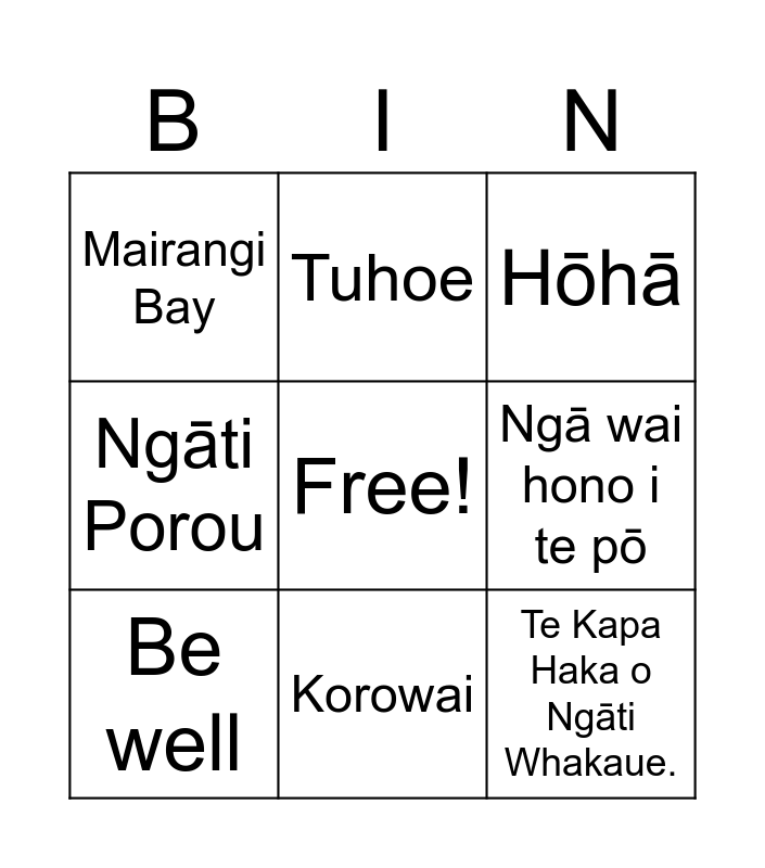 This bingo card has a free space and 21 words: Hinemoana, Wheke (Octopus), Tuhoe, Rangitoto, Tui, Be well, Mairangi Bay, Hōhā, Toki, Korowai, Tūmatauenga, Ngāti Porou, Te Waipounamu, Hiwa-i-te-Rangi, Ngā wai hono i te pō, Pūtaiao, Hone Heke, Kaikōura, Te Kapa Haka o Ngāti Whakaue., Rakiura and He Whakaputanga.