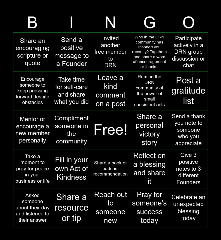 This bingo card has a free space and 24 words: Asked someone about their day and listened to their answer, Fill in your own Act of Kindness, Leave a kind comment on a post, Pray for someone’s success today, Participate actively in a DRN group discussion or chat, Share an encouraging scripture or quote, Send a positive message to a Founder, Invited another free member to DRN, Share a personal victory story, Send a thank you note to someone who you appreciate, Mentor or encourage a new member personally, Take time for self-care and share what you did, Reflect on a blessing and share it, Give 3 positive notes to 3 different Founders, Encourage someone to keep pressing forward despite obstacles, Share a resource or tip, Reach out to someone new, Who in the DRN community has inspired you recently? Tag them and share a word of encouragement or thanks!, Post a gratitude list, Take a moment to pray for peace in your business or life, Compliment someone in the community, Share a book or podcast recommendation, Remind the DRN community of the power of small consistent acts and Celebrate an unexpected blessing today.