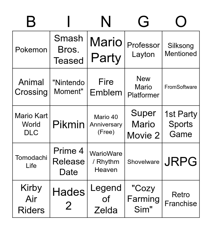 This bingo card has a free space and 24 words: Prime 4 Release Date, Hades 2, Fire Emblem, Kirby Air Riders, Silksong Mentioned, Pokemon, Animal Crossing, Smash Bros. Teased, Super Mario Movie 2, WarioWare / Rhythm Heaven, New Mario Platformer, Mario Kart World DLC, Shovelware, JRPG, "Nintendo Moment", "Cozy Farming Sim", 1st Party Sports Game, Mario Party, FromSoftware, Pikmin, Retro Franchise, Tomodachi Life, Professor Layton and Legend of Zelda.
