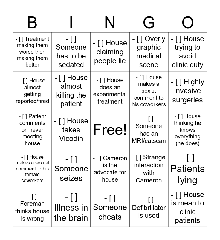 This bingo card has a free space and 41 words: - [ ] Someone contracts rare disease, - [ ] Someone seizes, - [ ] Someone gets put in the clean room, - [ ] House makes a sexist comment to his coworkers, - [ ] House is mean to clinic patients, - [ ] House makes a sexual comment to his female coworkers, - [ ] House takes Vicodin, - [ ] House insults his coworkers, - [ ] Overly graphic medical scene, - [ ] House thinking he knows everything (he does), - [ ] House almost getting reported/fired, - [ ] House almost killing the patient, - [ ] House does an experimental treatment, - [ ] Defibrillator is used, - [ ] Highly invasive surgeries, - [ ] Patient comments on never meeting house, - [ ] House guesses people’s backstory, - [ ] House claiming people lie, - [ ] House plays the piano, - [ ] House trying to avoid clinic duty, - [ ] Foreman thinks house is wrong, - [ ] Cuddy thinks house is wrong, - [ ] Cameron is the advocate for house, - [ ] Someone has an MRI/catscan, - [ ] Someone has an illness they contracted many years ago, - [ ] Someone is in exam room 1, - [ ] Illness in the brain, - [ ] Scans don’t show anything, - [ ] Strange interaction with Cameron, - [ ] Asking foreman to break into someone’s house, - [ ] Racist comments to foreman, - [ ] Someone has to be sedated, - [ ] Someone cheats, - [ ] Romantic tension between house and Cameron, - [ ] Patients lying, - [ ] Treatment making them worse then making them better, - [ ] Mysterious diseases, - [ ] Lethal diseases, - [ ] Thinking patients have cancer, - [ ] Thinking patients have a tumor and - [ ] Doctor being personally effected by patient.