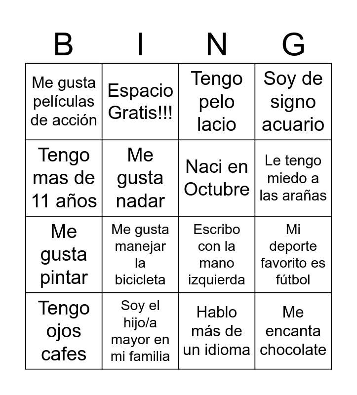This bingo card has 32 words: Tengo una mascota, Tengo una bicicleta, Mi deporte favorito es fútbol, Me encanta bailar, Me encanta chocolate, Naci en Octubre, Tengo mas de 11 años, Naci en otro país, Espacio Gratis!!!, Se tocar un Instrumento, Le tengo miedo a las arañas, Tengo pelo lacio, Tengo pelo café, Me gusta dibujar, Soy el hijo/a mayor en mi familia, Mi nombre tiene mas de 6 letras, Me gusta escuchar musica, Escribo con la mano izquierda, Tengo puesta una camisa negra, Me gusta comer vegetales, Se conducir un auto, Tengo más de 3 hermanas o hermanos, Hablo más de un idioma, Me gusta leer, Tengo ojos cafes, Soy de signo acuario, Me gusta pintar, Me gusta nadar, Me gusta películas de acción, Me gusta la comida picante, Mi mascota es un perro and Me gusta manejar la bicicleta.