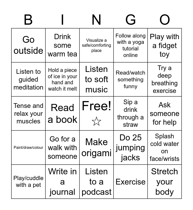 This bingo card has a free space and 24 words: Go for a walk with someone, Write in a journal, Listen to soft music, Play/cuddle with a pet, Play with a fidget toy, Go outside, Listen to guided meditation, Drink some warm tea, Sip a drink through a straw, Make origami, Read/watch something funny, Tense and relax your muscles, Do 25 jumping jacks, Splash cold water on face/wrists, Hold a piece of ice in your hand and watch it melt, Exercise, Ask someone for help, Visualize a safe/comforting place, Try a deep breathing exercise, Read a book, Stretch your body, Paint/draw/colour, Follow along with a yoga tutorial online and Listen to a podcast.