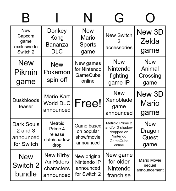 This bingo card has a free space and 24 words: Metroid Prime 4 release date/shadow drop, New Kirby Air Riders characters announced, New games for Nintendo GameCube online, New Switch 2 bundle, New 3D Zelda game, New Capcom game exclusive to Switch 2, New Pikmin game, Donkey Kong Bananza DLC, New Xenoblade game announced, Game based on popular show/movie announced, New Nintendo fighting game IP, Duskbloods teaser, Metroid Prime 2 and/or 3 shadow dropped on Nintendo GameCube online, New Dragon Quest game, New Pokemon spin off, New game for older Nintendo franchise, New 3D Mario game, New Mario Sports game, New Animal Crossing game, Mario Kart World DLC announced, Mario Movie sequel announcement, Dark Souls 2 and 3 announced for Switch, New Switch 2 accessories and New original Nintendo IP announced for Switch 2.