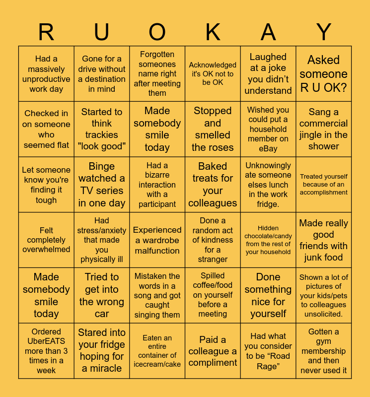 This bingo card has 36 words: Spilled coffee/food on yourself before a meeting, Mistaken the words in a song and got caught singing them, Paid a colleague a compliment, Checked in on someone who seemed flat, Felt completely overwhelmed, Baked treats for your colleagues, Started to think trackies "look good", Eaten an entire container of icecream/cake, Laughed at a joke you didn’t understand, Done something nice for yourself, Sang a commercial jingle in the shower, Acknowledged it's OK not to be OK, Shown a lot of pictures of your kids/pets to colleagues unsolicited., Binge watched a TV series in one day, Stopped and smelled the roses, Had a massively unproductive work day, Made somebody smile today, Unknowingly ate someone elses lunch in the work fridge., Let someone know you're finding it tough, Forgotten someones name right after meeting them, Had a bizarre interaction with a participant, Had stress/anxiety that made you physically ill, Done a random act of kindness for a stranger, Experienced a wardrobe malfunction, Hidden chocolate/candy from the rest of your household, Gone for a drive without a destination in mind, Wished you could put a household member on eBay, Stared into your fridge hoping for a miracle, Made somebody smile today, Asked someone R U OK?, Gotten a gym membership and then never used it, Ordered UberEATS more than 3 times in a week, Made really good friends with junk food, Treated yourself because of an accomplishment, Tried to get into the wrong car and Had what you consider to be “Road Rage”.