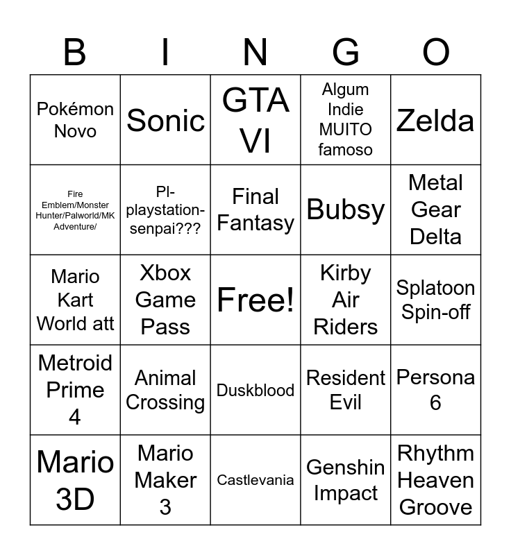 This bingo card has a free space and 29 words: Mario 3D, Carlos el topo que atira, Xbox Game Pass, Pokémon ZA, Pokémon Novo, GTA VI, Pl-playstation-senpai???, Animal Crossing, Kirby Air Riders, Mario Maker 3, Splatoon Spin-off, Rhythm Heaven Groove, Castlevania, Genshin Impact, Metal Gear Delta, Elden Ring/Souls Like, Duskblood, Metroid Prime 4, Zelda, Mario Kart World att, Resident Evil, Focado no Mouse, Bubsy, Fire Emblem/Monster Hunter/Palworld/MK Adventure/, Algum Indie MUITO famoso, Sonic, Persona 6, Final Fantasy and Jogo Fitness.