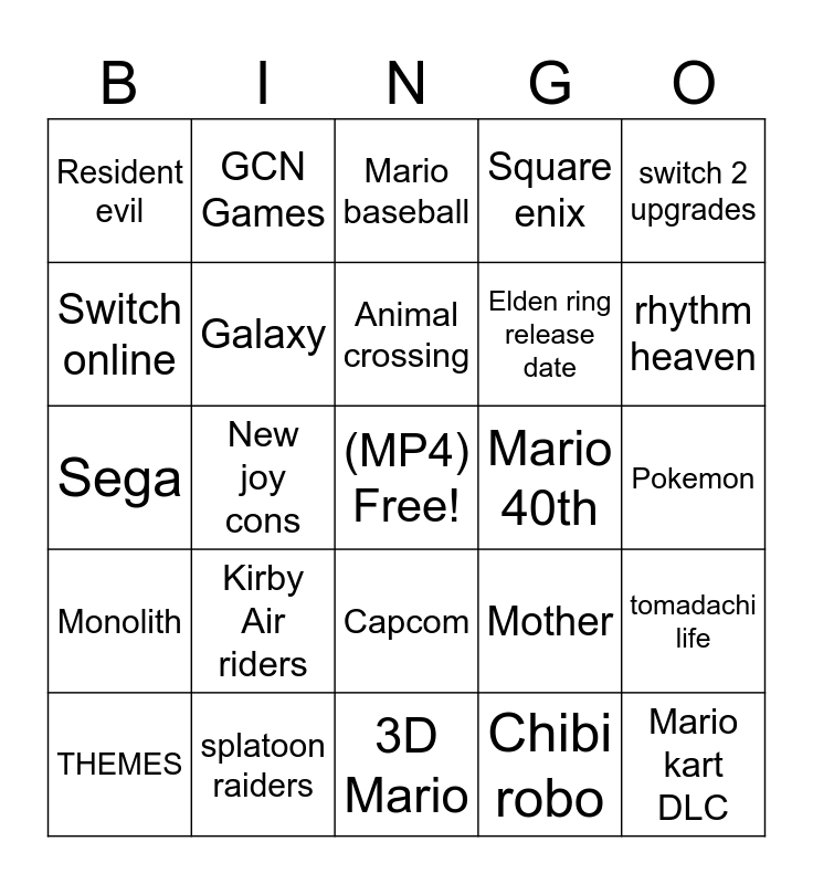 This bingo card has a free space and 24 words: Kirby Air riders, splatoon raiders, Animal crossing, THEMES, switch 2 upgrades, Resident evil, Switch online, GCN Games, Mario 40th, Capcom, Elden ring release date, Sega, Mother, tomadachi life, Galaxy, Chibi robo, Pokemon, Mario baseball, rhythm heaven, New joy cons, Mario kart DLC, Monolith, Square enix and 3D Mario.
