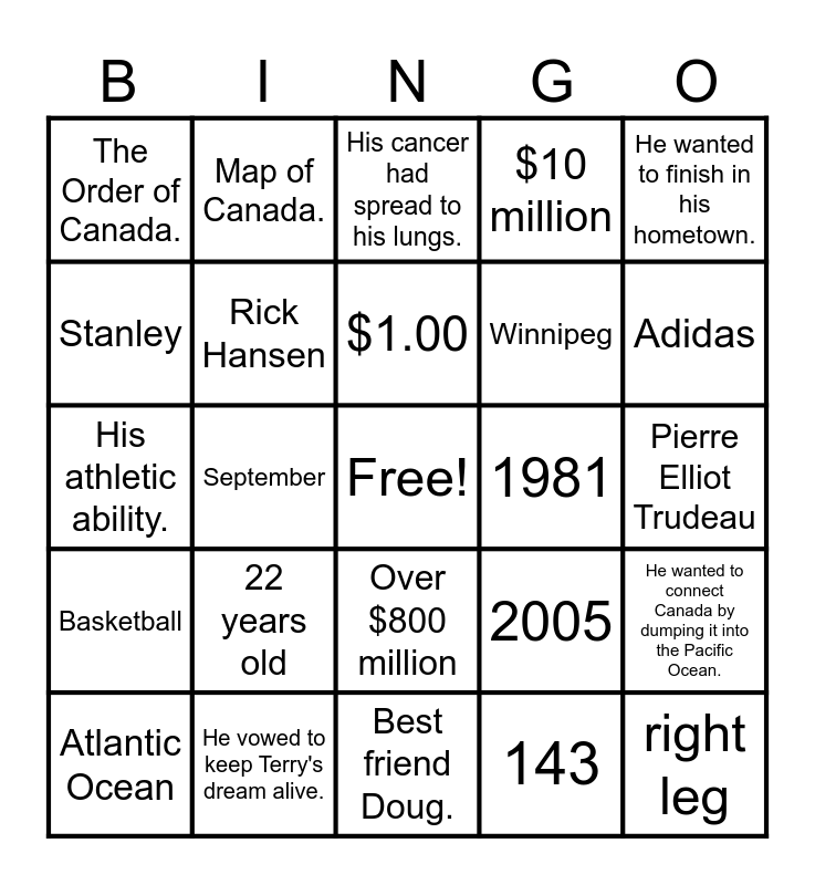 This bingo card has a free space and 44 words: 1980, right leg, 5000 km, Atlantic Ocean, 42 km, 143, His cancer had spread to his lungs., Thunder Bay, ON, He wanted to finish in his hometown., He vowed to keep Terry's dream alive., $10 million, 1981, Over $800 million, 22 years old, Runs were held all around the world., Best friend Doug., Athlete of the Year, His athletic ability., 18, Adidas, Map of Canada., The Toronto Maple Leafs, Cancer survivors, The Order of Canada., All of the above, Pierre Elliot Trudeau, A new statue in his honour., "... if you try.", 2005, Basketball, It was used to collect donations., He wanted to connect Canada by dumping it into the Pacific Ocean., "... keep going without me.", All of these words, September, Osteogenic cancer, Physical Education Teacher, 3, $1.00, Stanley, Winnipeg, Port Coquitlam, Rick Hansen and 45th.