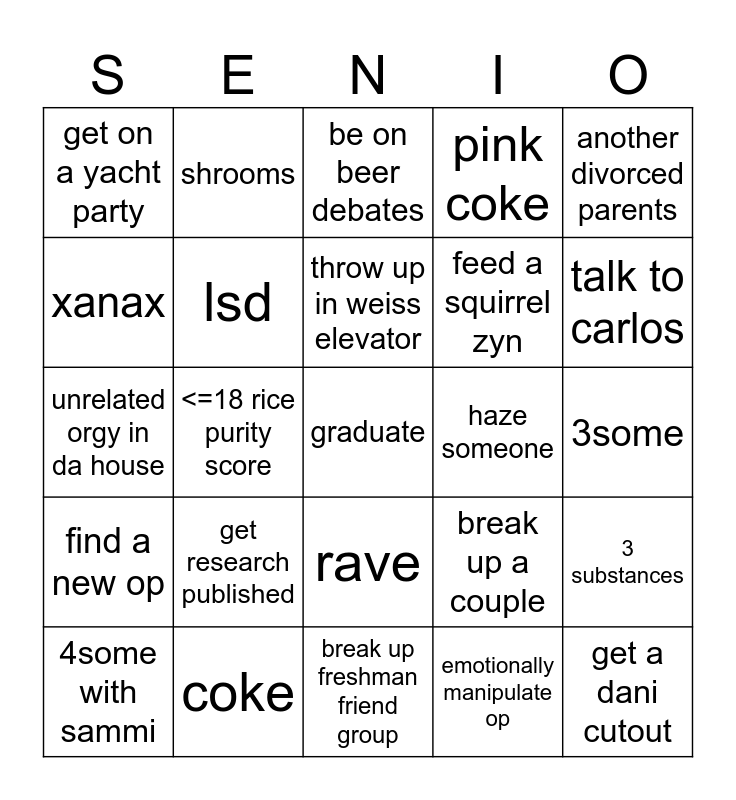 This bingo card has a free space and 24 words: get research published, coke, throw up in weiss elevator, 4some with sammi, another divorced parents, get on a yacht party, xanax, shrooms, haze someone, rave, feed a squirrel zyn, unrelated orgy in da house, break up a couple, 3 substances, lsd, emotionally manipulate op, 3some, be on beer debates, talk to carlos, <=18 rice purity score, get a dani cutout, find a new op, pink coke and break up freshman friend group.