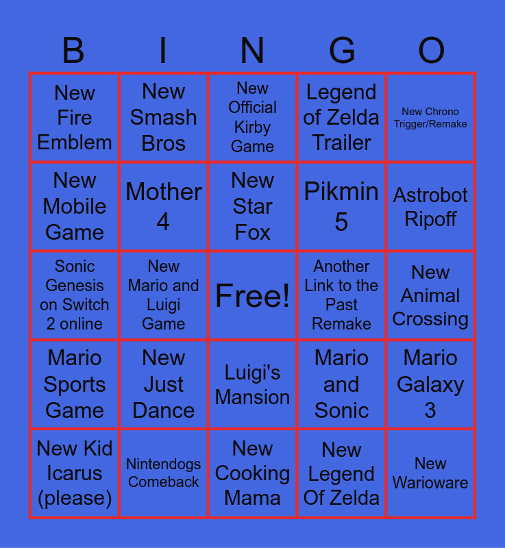This bingo card has a free space and 24 words: New Kid Icarus (please), New Just Dance, New Star Fox, New Legend Of Zelda, New Chrono Trigger/Remake, New Fire Emblem, New Smash Bros, New Official Kirby Game, Another Link to the Past Remake, New Animal Crossing, Sonic Genesis on Switch 2 online, Mother 4, Mario and Sonic, Mario Galaxy 3, New Mobile Game, Nintendogs Comeback, New Cooking Mama, Legend of Zelda Trailer, Astrobot Ripoff, Mario Sports Game, New Mario and Luigi Game, Luigi's Mansion, Pikmin 5 and New Warioware.