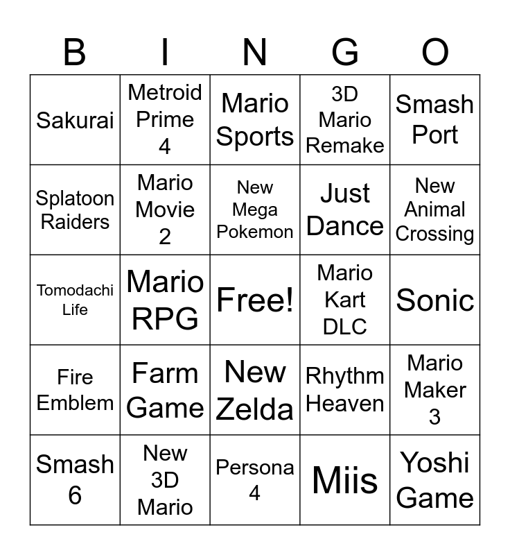 This bingo card has a free space and 24 words: Farm Game, New 3D Mario, New Mega Pokemon, Smash 6, Smash Port, Sakurai, Splatoon Raiders, Metroid Prime 4, Mario Kart DLC, New Zelda, Just Dance, Tomodachi Life, Rhythm Heaven, Mario Maker 3, Mario Movie 2, Miis, Sonic, Mario Sports, New Animal Crossing, Mario RPG, Yoshi Game, Fire Emblem, 3D Mario Remake and Persona 4.