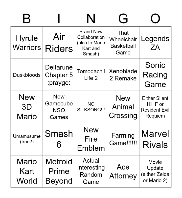 This bingo card has a free space and 24 words: Smash 6, Metroid Prime Beyond, Tomodachii Life 2, Mario Kart World, Legends ZA, Hyrule Warriors, Duskbloods, Air Riders, New Animal Crossing, New Fire Emblem, Xenoblade 2 Remake, New 3D Mario, Farming Game!!!!!!, Marvel Rivals, Deltarune Chapter 5 :prayge:, Ace Attorney, Either Silent Hill F or Resident Evil Requiem, Brand New Collaboration (akin to Mario Kart and Smash), Sonic Racing Game, New Gamecube NSO Games, Movie Update (either Zelda or Mario 2), Umamusume (true?), That Wheelchair Basketball Game and Actual Interesting Random Game.