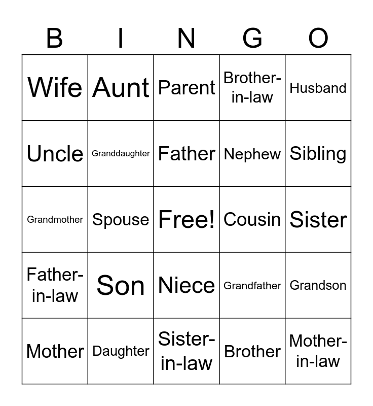 This bingo card has a free space and 24 words: Son, Daughter, Father, Mother, Husband, Wife, Uncle, Aunt, Cousin, Niece, Nephew, Grandmother, Grandfather, Grandson, Granddaughter, Brother, Sister, Parent, Sibling, Spouse, Mother-in-law, Father-in-law, Brother-in-law and Sister-in-law.