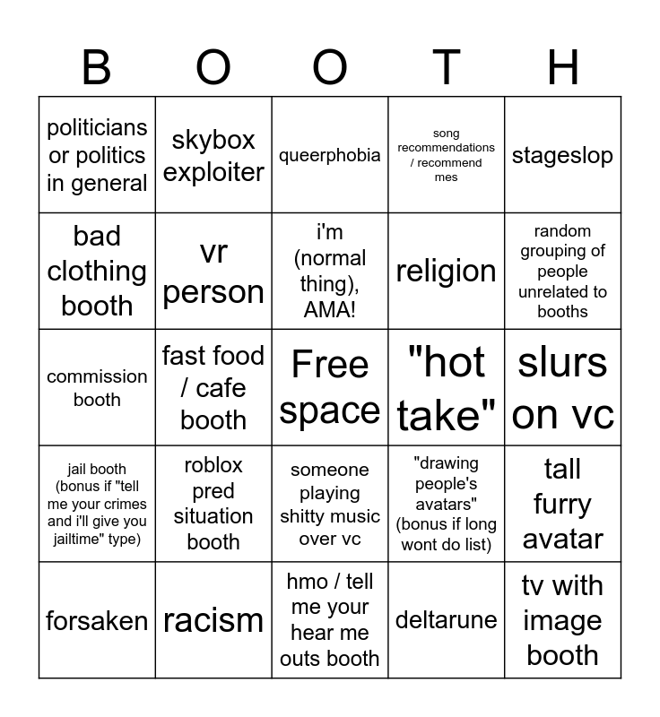 This bingo card has a free space and 24 words: roblox pred situation booth, racism, i'm (normal thing), AMA!, forsaken, stageslop, politicians or politics in general, bad clothing booth, skybox exploiter, "hot take", someone playing shitty music over vc, religion, commission booth, "drawing people's avatars" (bonus if long wont do list), tall furry avatar, vr person, deltarune, slurs on vc, queerphobia, random grouping of people unrelated to booths, fast food / cafe booth, tv with image booth, jail booth (bonus if "tell me your crimes and i'll give you jailtime" type), song recommendations / recommend mes and hmo / tell me your hear me outs booth.