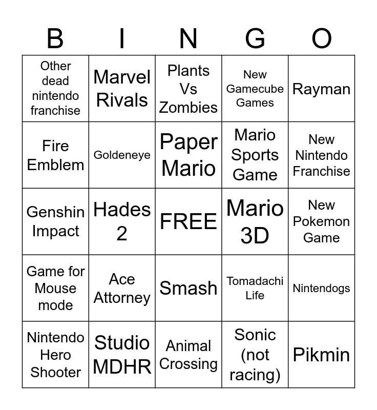 This bingo card has a free space and 24 words: Ace Attorney, Studio MDHR, Paper Mario, Nintendo Hero Shooter, Rayman, Other dead nintendo franchise, Fire Emblem, Marvel Rivals, Mario 3D, Smash, Mario Sports Game, Genshin Impact, Tomadachi Life, Nintendogs, Goldeneye, Sonic (not racing), New Pokemon Game, Plants Vs Zombies, New Nintendo Franchise, Hades 2, Pikmin, Game for Mouse mode, New Gamecube Games and Animal Crossing.