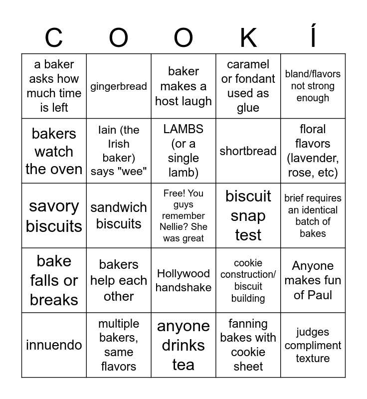 This bingo card has a free space and 24 words: bakers help each other, multiple bakers, same flavors, LAMBS (or a single lamb), innuendo, bland/flavors not strong enough, a baker asks how much time is left, bakers watch the oven, gingerbread, biscuit snap test, Hollywood handshake, shortbread, savory biscuits, cookie construction/ biscuit building, Anyone makes fun of Paul, Iain (the Irish baker) says "wee", fanning bakes with cookie sheet, brief requires an identical batch of bakes, baker makes a host laugh, floral flavors (lavender, rose, etc), sandwich biscuits, judges compliment texture, bake falls or breaks, caramel or fondant used as glue and anyone drinks tea.