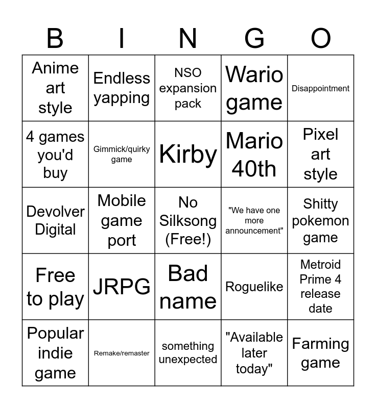 This bingo card has a free space and 24 words: JRPG, Remake/remaster, Kirby, Popular indie game, Disappointment, Anime art style, 4 games you'd buy, Endless yapping, "We have one more announcement", Bad name, Mario 40th, Devolver Digital, Roguelike, Metroid Prime 4 release date, Gimmick/quirky game, "Available later today", Shitty pokemon game, NSO expansion pack, Pixel art style, Mobile game port, Farming game, Free to play, Wario game and something unexpected.