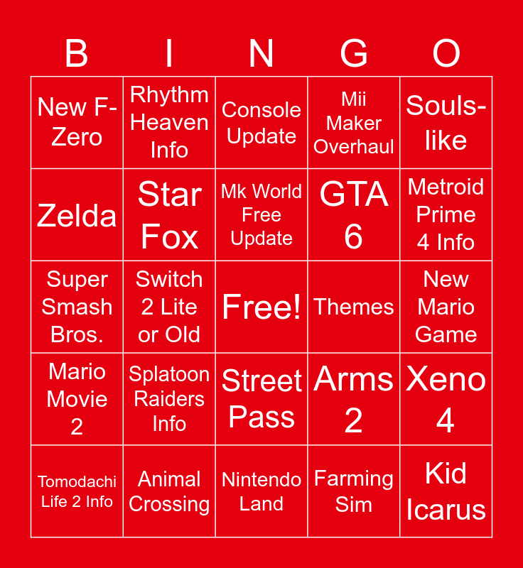 This bingo card has a free space and 24 words: Tomodachi Life 2 Info, Splatoon Raiders Info, Mk World Free Update, Farming Sim, Souls-like, New F- Zero, Rhythm Heaven Info, Console Update, Themes, New Mario Game, Super Smash Bros., Star Fox, Arms 2, Xeno 4, Zelda, Animal Crossing, Nintendo Land, Mii Maker Overhaul, Metroid Prime 4 Info, Mario Movie 2, Switch 2 Lite or Old, Street Pass, GTA 6 and Kid Icarus.