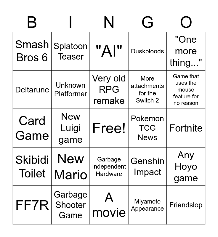 This bingo card has a free space and 24 words: New Mario, Garbage Shooter Game, Very old RPG remake, FF7R, "One more thing...", Smash Bros 6, Deltarune, Splatoon Teaser, Pokemon TCG News, Garbage Independent Hardware, More attachments for the Switch 2, Card Game, Genshin Impact, Any Hoyo game, Unknown Platformer, Miyamoto Appearance, Fortnite, "AI", Game that uses the mouse feature for no reason, New Luigi game, Friendslop, Skibidi Toilet, Duskbloods and A movie.