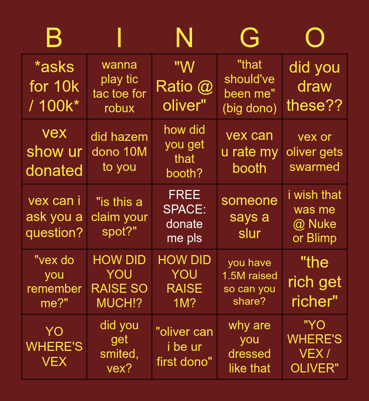 This bingo card has a free space and 26 words: HOW DID YOU RAISE 1M?, why are you dressed like that, how did you get that booth?, did you get smited, vex?, did you draw these??, *asks for 10k / 100k*, vex show ur donated, wanna play tic tac toe for robux, i wish that was me @ Nuke or Blimp, you have 1.5M raised so can you share?, vex can u rate my booth, vex can i ask you a question?, "the rich get richer", YO WHERE'S VEX, "is this a claim your spot?", "are you a streamer?", "that should've been me" (big dono), "vex do you remember me?", "W Ratio @ oliver", "YO WHERE'S VEX / OLIVER", vex or oliver gets swarmed, "oliver can i be ur first dono", someone says a slur, HOW DID YOU RAISE SO MUCH!?, did hazem dono 10M to you and vex how much robux do you have.