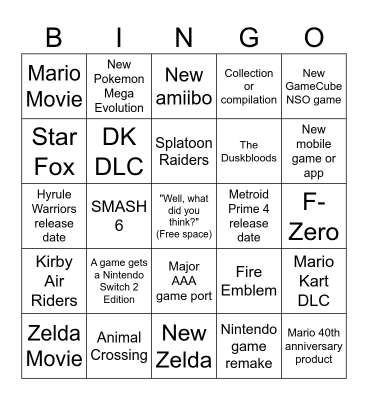 This bingo card has a free space and 24 words: A game gets a Nintendo Switch 2 Edition, Animal Crossing, Splatoon Raiders, Zelda Movie, New GameCube NSO game, Mario Movie, Star Fox, New Pokemon Mega Evolution, Metroid Prime 4 release date, Major AAA game port, The Duskbloods, Hyrule Warriors release date, Fire Emblem, Mario Kart DLC, DK DLC, Nintendo game remake, F-Zero, New amiibo, New mobile game or app, SMASH 6, Mario 40th anniversary product, Kirby Air Riders, Collection or compilation and New Zelda.