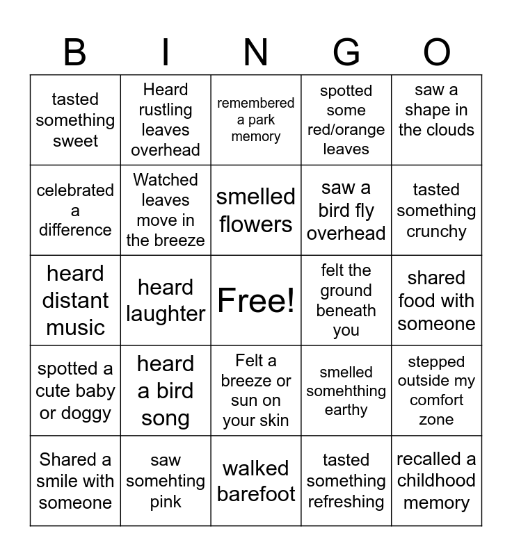 This bingo card has a free space and 39 words: Tasted something crunchy, Saw a color that makes you smile, Spotted a shadow or sunlight pattern, Watched leaves move in the breeze, Shared a smile with someone, Felt a breeze or sun on your skin, smelled flowers, tried something new, saw a shape in the clouds, spotted a cute baby or doggy, heard laughter, spotted some red/orange leaves, recalled a childhood memory, shared food with someone, felt the ground beneath you, heard a bird song, noticed your breath deepen, tasted something sweet, made a friend, smelled somehthing earthy, celebrated a difference, walked barefoot, saw a bird fly overhead, tasted something crunchy, Felt your hands relax in your lap, caught yourself smiling naturally, Spotted a squirrel, Hear a dog bark, saw a seaplane, Heard rustling leaves overhead, smelled bug spray, shared a story with someone new, remembered a park memory, saw somehting pink, tasted something refreshing, heard a baby cry, stepped outside my comfort zone, heard distant music and saw a bicycle.