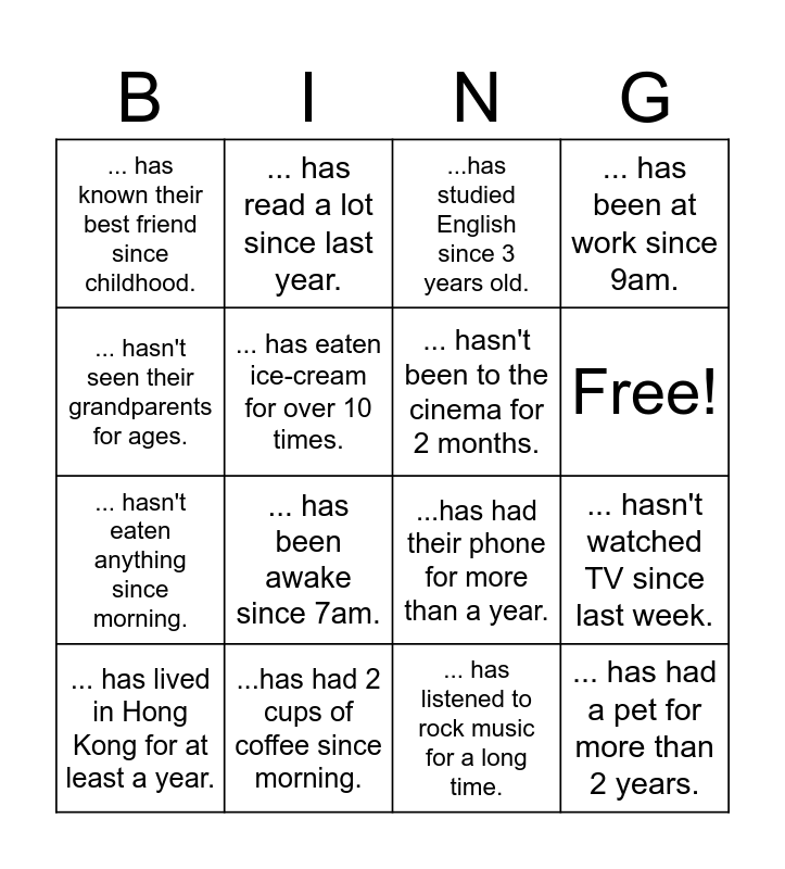 This bingo card has 18 words: ... has been awake since 7am., ... has had a pet for more than 2 years., ...has studied English since 3 years old., ... has known their best friend since childhood., ...has had their phone for more than a year., ... has been at work since 9am., ... has lived in Hong Kong for at least a year., ... has read a lot since last year., Free!, ... hasn't eaten anything since morning., ... has listened to rock music for a long time., ... hasn't seen their grandparents for ages., ... hasn't watched TV since last week., ... has eaten ice-cream for over 10 times., ... hasn't been to the cinema for 2 months., ... hasn't been to Japan for a long time., ...has had 2 cups of coffee since morning. and ...hasn't been on holiday since summer..
