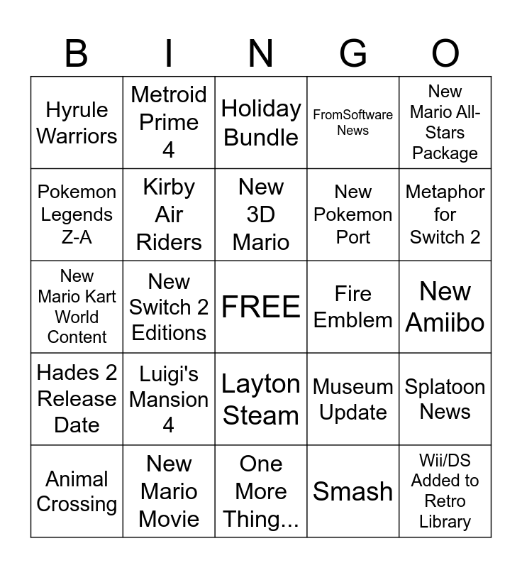 This bingo card has a free space and 24 words: Luigi's Mansion 4, New Mario Movie, New 3D Mario, Animal Crossing, New Mario All-Stars Package, Hyrule Warriors, Pokemon Legends Z-A, Metroid Prime 4, Fire Emblem, Layton Steam, New Pokemon Port, New Mario Kart World Content, Museum Update, Splatoon News, Kirby Air Riders, Smash, New Amiibo, Holiday Bundle, Metaphor for Switch 2, New Switch 2 Editions, Wii/DS Added to Retro Library, Hades 2 Release Date, FromSoftware News and One More Thing....