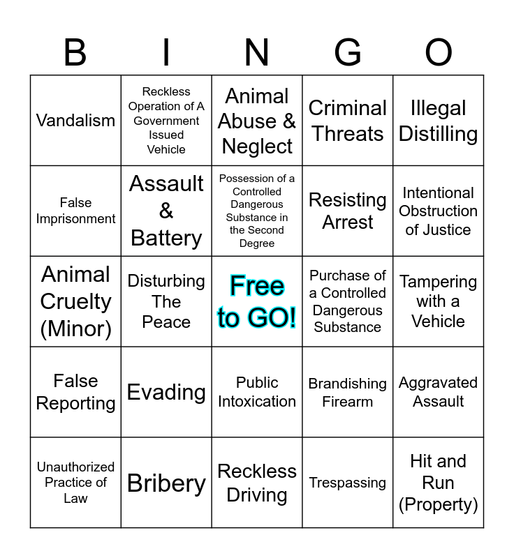 This bingo card has a free space and 47 words: Driving Under The Influence, Hit and Run (Property), Street Racing, Reckless Driving, Evading, Misuse of a Government Issued Occupational Vehicle, Reckless Operation of A Government Issued Vehicle, Misuse of a Rental Vehicle, False Imprisonment, Petty Larceny, Assault & Battery, Criminal Threats, Aggravated Assault, Brandishing Firearm, Negligent Discharge of a Firearm, Brandishing Non Firearm, Possession of a Controlled Dangerous Substance in the Second Degree, Purchase of a Controlled Dangerous Substance, Riot, Illegal Distilling, Disturbing The Peace, Trespassing, Vandalism, Resisting Arrest, Failure to Comply with a Peace Officer, Intentional Obstruction of Justice, Unauthorized Practice of Law, Misuse of 911, Public Intoxication, False Reporting, Flying Without a License, Unauthorized Flight into Restricted Airspace, Operating an Aircraft while Intoxicated, Theft of a Motor Vehicle, Possession of a Stolen Identification, Bribery, Tampering with a Vehicle, Impersonation, Possession of Restricted Government Equipment, Theft of an Aircraft, Hunting Without a License, Animal Abuse & Neglect, Animal Cruelty (Minor), Failure to Appear In Court, Contempt of Court, Violating A Court Order and Failure to Pay Fine or Citation.