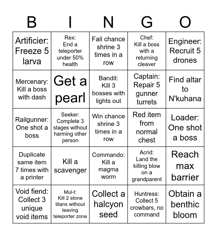 This bingo card has 26 words: Commando: Kill a magma worm, Huntress: Collect 5 crowbars, no command, Bandit: Kill 3 bosses with lights out, Mul-t: Kill 2 stone titans without leaving teleporter zone, Engineer: Recruit 5 drones, Artificier: Freeze 5 larva, Mercenary: Kill a boss with dash, Rex: End a teleporter under 50% health, Loader: One shot a boss, Acrid: Land the killing blow on a grandparent, Captain: Repair 5 gunner turrets, Railgunner: One shot a boss, Reach max barrier, Void fiend: Collect 3 unique void items, Seeker: Complete 3 stages without harming other person, False son: Gain 20 lunar spikes, Chef: Kill a boss with a returning cleaver, Duplicate same item 7 times with a printer, Fail chance shrine 3 times in a row, Win chance shrine 3 times in a row, Find altar to N'kuhana, Collect a halcyon seed, Red item from normal chest, Kill a scavenger, Get a pearl and Obtain a benthic bloom.