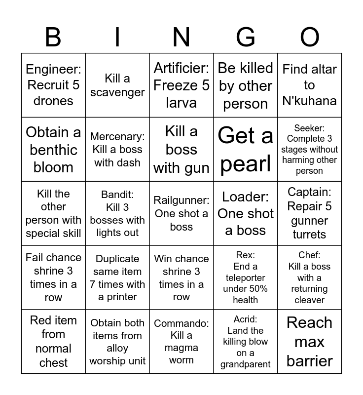 This bingo card has 31 words: Commando: Kill a magma worm, Huntress: Collect 5 crowbars, no command, Bandit: Kill 3 bosses with lights out, Mul-t: Kill 2 stone titans without leaving teleporter zone, Engineer: Recruit 5 drones, Artificier: Freeze 5 larva, Mercenary: Kill a boss with dash, Rex: End a teleporter under 50% health, Loader: One shot a boss, Acrid: Land the killing blow on a grandparent, Captain: Repair 5 gunner turrets, Railgunner: One shot a boss, Reach max barrier, Void fiend: Collect 3 unique void items, Seeker: Complete 3 stages without harming other person, False son: Gain 20 lunar spikes, Chef: Kill a boss with a returning cleaver, Duplicate same item 7 times with a printer, Fail chance shrine 3 times in a row, Win chance shrine 3 times in a row, Find altar to N'kuhana, Collect a halcyon seed, Red item from normal chest, Kill a scavenger, Get a pearl, Obtain a benthic bloom, Be killed by other person, Kill the other person with special skill, Obtain both items from alloy worship unit, Kill a boss with gun and Become the heretic.