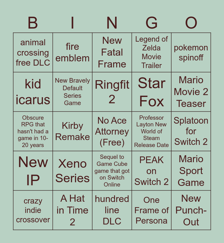 This bingo card has a free space and 24 words: Xeno Series, A Hat in Time 2, Ringfit 2, crazy indie crossover, pokemon spinoff, animal crossing free DLC, kid icarus, fire emblem, Professor Layton New World of Steam Release Date, Sequel to Game Cube game that got on Switch Online, Star Fox, Obscure RPG that hasn't had a game in 10-20 years, PEAK on Switch 2, Mario Sport Game, New Bravely Default Series Game, One Frame of Persona, Splatoon for Switch 2, New Fatal Frame, Mario Movie 2 Teaser, Kirby Remake, New Punch-Out, New IP, Legend of Zelda Movie Trailer and hundred line DLC.