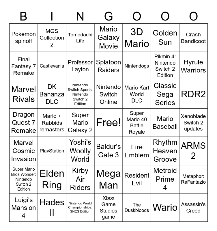 This bingo card has a free space and 48 words: Resident Evil, Pikmin 4: Nintendo Switch 2 Edition, Xbox Game Studios game, Mario + Rabbids remasters, Nintendo Switch Sports: Nintendo Switch 2 Edition, Xenoblade Switch 2 updates, MGS Collection 2, Hades II, Golden Sun, Baldur's Gate 3, Crash Bandicoot, Mario Galaxy Movie, Classic Sega Series, Mario Kart World DLC, Super Mario Bros Wonder: Nintendo Switch 2 Edition, Mario Baseball, Final Fantasy 7 Remake, Hyrule Warriors, Metroid Prime 4, 3D Mario, Nintendogs, Super Mario Galaxy 2, Pokemon spinoff, Castlevania, Metaphor: ReFantazio, Professor Layton, RDR2, Luigi's Mansion 4, Nintendo Switch Online, DK Bananza DLC, Wario, Super Mario 40 Battle Royale, ARMS 2, Elden Ring, Dragon Quest 7 Remake, Fire Emblem, Rhythm Heaven Groove, Marvel Rivals, Yoshi's Woolly World, Kirby Air Riders, Marvel Cosmic Invasion, Assassin's Creed, Tomodachi Life, Nintendo World Championships: SNES Edition, Splatoon Raiders, Mega Man, PlayStation and The Duskbloods.