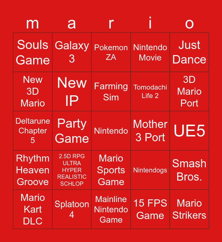 This bingo card has a free space and 27 words: Nintendogs, Mario Maker, Tomodachi Life 2, Mainline Nintendo Game, New 3D Mario, Pokemon ZA, Galaxy 3, Rhythm Heaven Groove, Mother 3 Port, Smash Bros., Deltarune Chapter 5, Nintendo Movie, Mario Kart DLC, Splatoon 4, 3D Mario Port, Zelda, New IP, Farming Sim, 2.5D RPG ULTRA HYPER REALISTIC SCHLOP, Souls Game, UE5, 15 FPS Game, Party Game, Mario Strikers, Mario Sports Game, Just Dance and Rabbids Game.