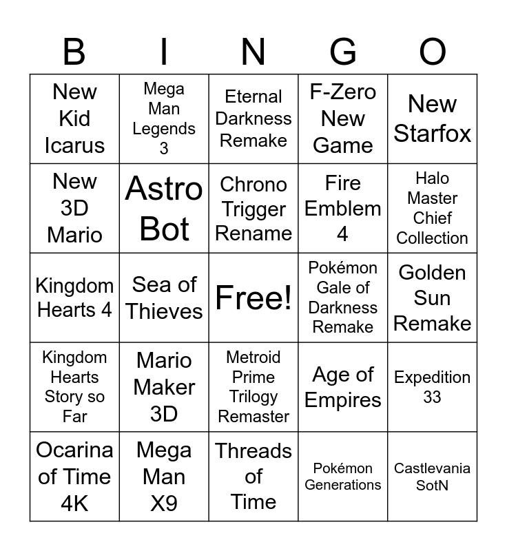 This bingo card has a free space and 24 words: Mario Maker 3D, Mega Man X9, Chrono Trigger Rename, Ocarina of Time 4K, New Starfox, New Kid Icarus, New 3D Mario, Mega Man Legends 3, Pokémon Gale of Darkness Remake, Metroid Prime Trilogy Remaster, Fire Emblem 4, Kingdom Hearts 4, Age of Empires, Expedition 33, Astro Bot, Pokémon Generations, Golden Sun Remake, Eternal Darkness Remake, Halo Master Chief Collection, Sea of Thieves, Castlevania SotN, Kingdom Hearts Story so Far, F-Zero New Game and Threads of Time.
