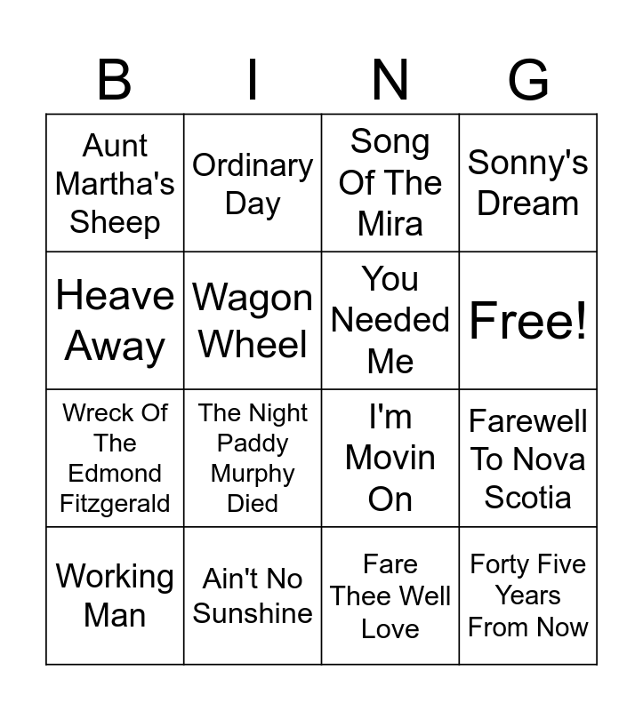 This bingo card has 17 words: Fare Thee Well Love, Working Man, Song Of The Mira, Aunt Martha's Sheep, The Night Paddy Murphy Died, Sonny's Dream, Farewell To Nova Scotia, You Needed Me, Free!, Wagon Wheel, Ain't No Sunshine, I'm Movin On, Heave Away, Ordinary Day, Wreck Of The Edmond Fitzgerald, Sunday Morning Coming Down and Forty Five Years From Now.