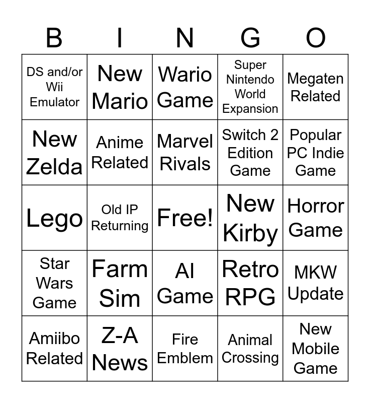This bingo card has a free space and 24 words: Farm Sim, Z-A News, Marvel Rivals, Amiibo Related, Megaten Related, DS and/or Wii Emulator, New Zelda, New Mario, New Kirby, AI Game, Switch 2 Edition Game, Lego, Retro RPG, MKW Update, Anime Related, Animal Crossing, Horror Game, Wario Game, Popular PC Indie Game, Old IP Returning, New Mobile Game, Star Wars Game, Super Nintendo World Expansion and Fire Emblem.
