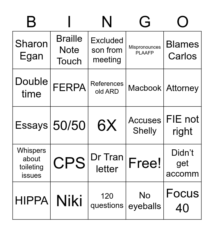This bingo card has 25 words: CPS, 120 questions, References old ARD, HIPPA, Blames Carlos, Sharon Egan, Double time, Braille Note Touch, Accuses Shelly, Dr Tran letter, Macbook, Essays, Free!, Didn’t get accomm, FERPA, Focus 40, FIE not right, Excluded son from meeting, Attorney, 50/50, 6X, Niki, Whispers about toileting issues, Mispronounces PLAAFP and No eyeballs.