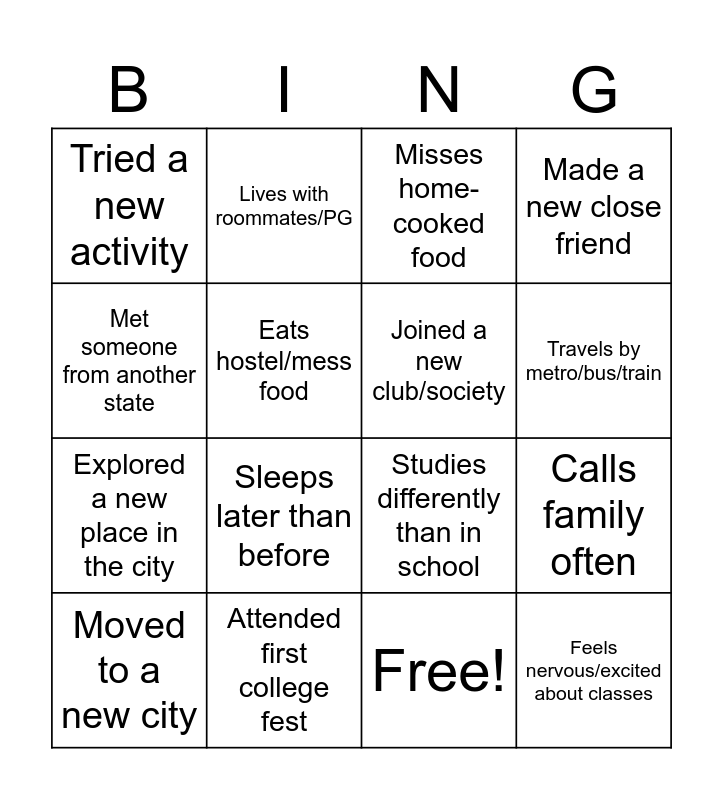 This bingo card has 17 words: Free!, Moved to a new city, Misses home-cooked food, Tried a new activity, Sleeps later than before, Made a new close friend, Calls family often, Joined a new club/society, Travels by metro/bus/train, Eats hostel/mess food, Attended first college fest, Studies differently than in school, Met someone from another state, Lives with roommates/PG, Explored a new place in the city, Does their own laundry and Feels nervous/excited about classes.