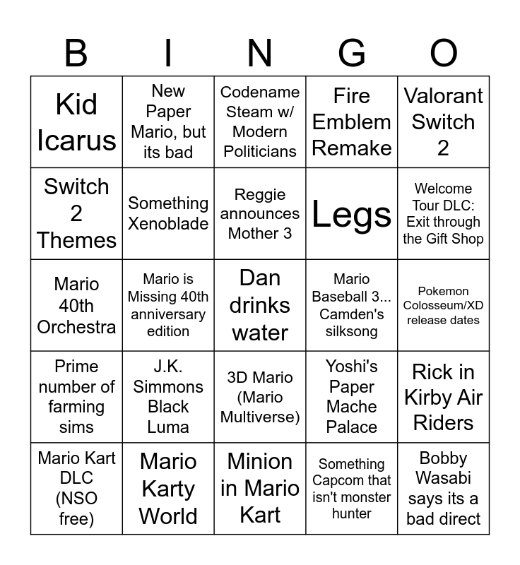 This bingo card has a free space and 24 words: J.K. Simmons Black Luma, Mario Karty World, Reggie announces Mother 3, Mario Kart DLC (NSO free), Valorant Switch 2, Kid Icarus, Switch 2 Themes, New Paper Mario, but its bad, Mario Baseball 3... Camden's silksong, 3D Mario (Mario Multiverse), Legs, Mario 40th Orchestra, Yoshi's Paper Mache Palace, Rick in Kirby Air Riders, Something Xenoblade, Something Capcom that isn't monster hunter, Pokemon Colosseum/XD release dates, Codename Steam w/ Modern Politicians, Welcome Tour DLC: Exit through the Gift Shop, Mario is Missing 40th anniversary edition, Bobby Wasabi says its a bad direct, Prime number of farming sims, Fire Emblem Remake and Minion in Mario Kart.