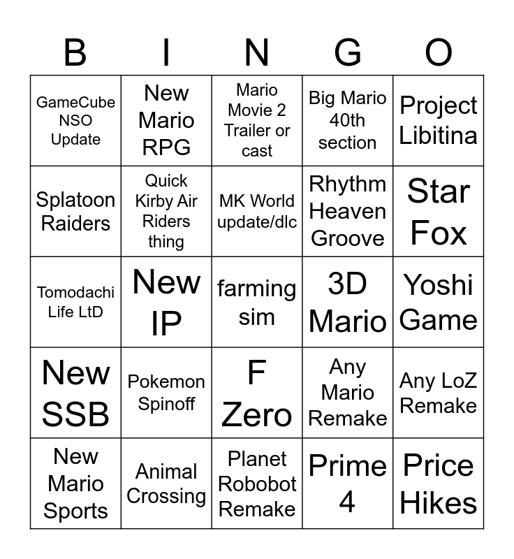 This bingo card has a free space and 24 words: Pokemon Spinoff, Animal Crossing, MK World update/dlc, New Mario Sports, Project Libitina, GameCube NSO Update, Splatoon Raiders, New Mario RPG, 3D Mario, F Zero, Rhythm Heaven Groove, Tomodachi Life LtD, Any Mario Remake, Any LoZ Remake, Quick Kirby Air Riders thing, Prime 4, Yoshi Game, Mario Movie 2 Trailer or cast, Star Fox, New IP, Price Hikes, New SSB, Big Mario 40th section and Planet Robobot Remake.