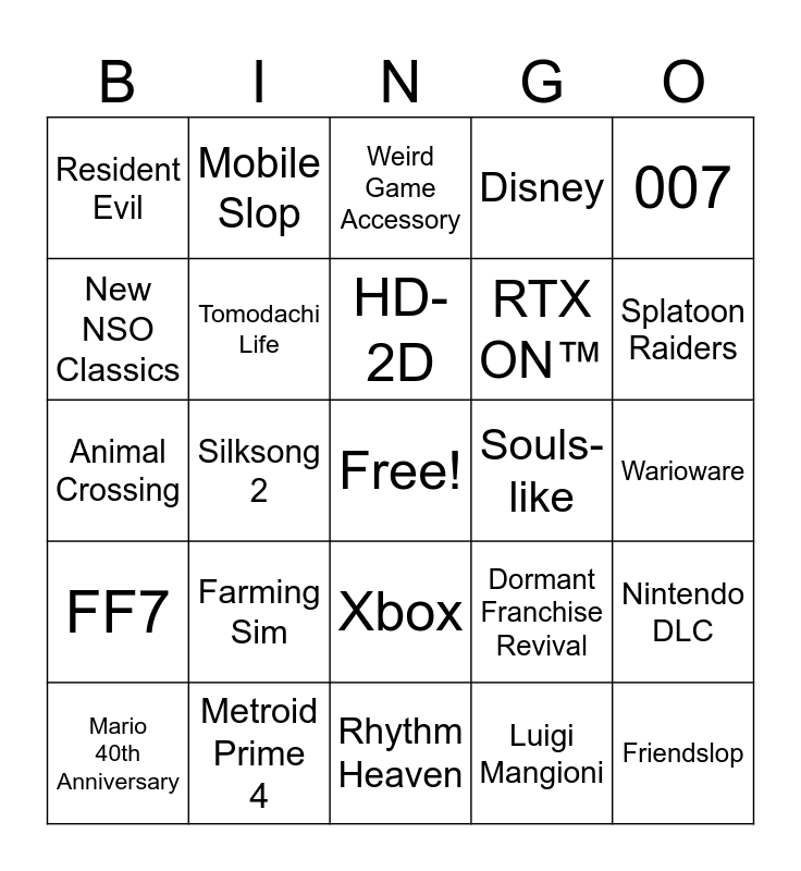 This bingo card has a free space and 24 words: Farming Sim, Metroid Prime 4, HD-2D, Mario 40th Anniversary, 007, Resident Evil, New NSO Classics, Mobile Slop, Souls-like, Xbox, RTX ON™, Animal Crossing, Dormant Franchise Revival, Nintendo DLC, Tomodachi Life, Luigi Mangioni, Warioware, Weird Game Accessory, Splatoon Raiders, Silksong 2, Friendslop, FF7, Disney and Rhythm Heaven.