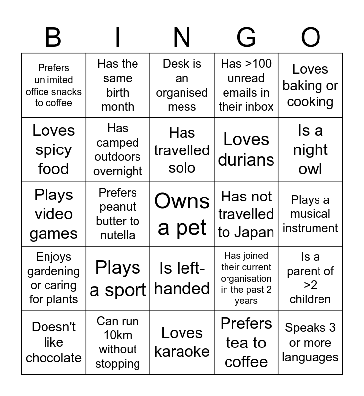 This bingo card has 30 words: Can run 10km without stopping, Prefers hokkien mee to char kway teow, Prefers peanut butter to nutella, Rather not shower for 3 days than to take a cold shower, Prefers unlimited office snacks to coffee, Desk is an organised mess, Has camped outdoors overnight, Is left-handed, Has not travelled to Japan, Loves karaoke, Plays a musical instrument, Owns a pet, Prefers tea to coffee, Speaks 3 or more languages, Is a night owl, Has worked in their current organisation for >10 years, Has joined their current organisation in the past 2 years, Enjoys gardening or caring for plants, Plays a sport, Loves baking or cooking, Plays video games, Has tried bungee jumping or skydiving, Has the same birth month, Loves durians, Loves spicy food, Has >100 unread emails in their inbox, Is a parent of >2 children, Doesn't like chocolate, Has travelled solo and Prefers mountains to beaches.
