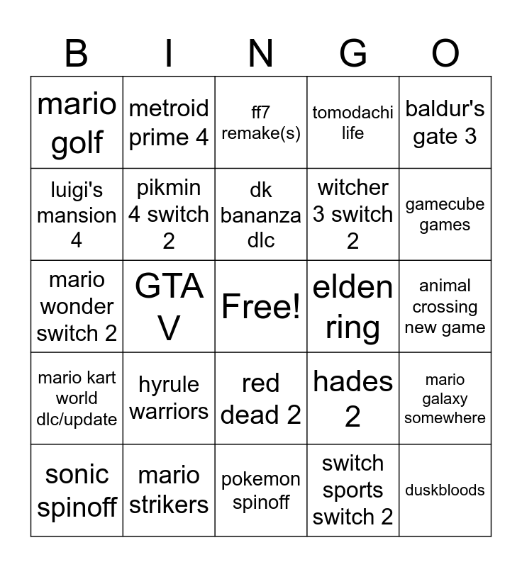 This bingo card has a free space and 24 words: hyrule warriors, mario strikers, dk bananza dlc, sonic spinoff, baldur's gate 3, mario golf, luigi's mansion 4, metroid prime 4, elden ring, red dead 2, witcher 3 switch 2, mario wonder switch 2, hades 2, mario galaxy somewhere, pikmin 4 switch 2, switch sports switch 2, animal crossing new game, ff7 remake(s), gamecube games, GTA V, duskbloods, mario kart world dlc/update, tomodachi life and pokemon spinoff.