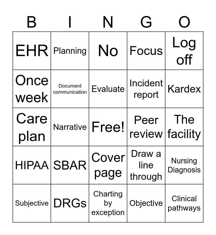 This bingo card has a free space and 29 words: Subjective, Introduction, Narrative, EMR, EHR, No, Document communication, SBAR, Peer review, DRGs, The facility, Clinical pathways, Charting by exception, Objective, Kardex, Military, Cover page, HIPAA, Log off, Care plan, Draw a line through, 12:00, Incident report, Once week, Focus, Planning, Nursing Diagnosis, Evaluate and Assessment.