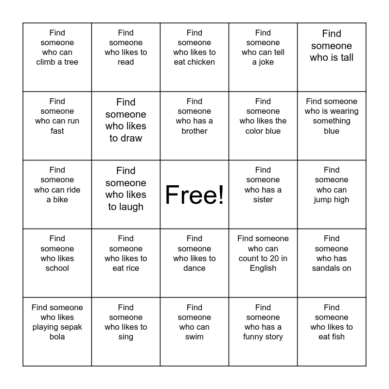 This bingo card has a free space and 24 words: Find someone who likes to eat rice, Find someone who likes to sing, Find someone who has a brother, Find someone who likes playing sepak bola, Find someone who is tall, Find someone who can climb a tree, Find someone who can run fast, Find someone who likes to read, Find someone who has a sister, Find someone who likes to dance, Find someone who likes the color blue, Find someone who can ride a bike, Find someone who can count to 20 in English, Find someone who has sandals on, Find someone who likes to draw, Find someone who has a funny story, Find someone who can jump high, Find someone who likes to eat chicken, Find someone who is wearing something blue, Find someone who likes to laugh, Find someone who likes to eat fish, Find someone who likes school, Find someone who can tell a joke and Find someone who can swim.