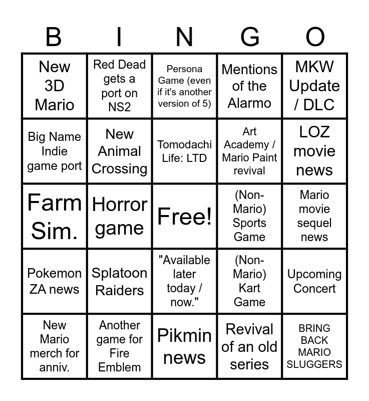 This bingo card has a free space and 24 words: Splatoon Raiders, Another game for Fire Emblem, Tomodachi Life: LTD, New Mario merch for anniv., MKW Update / DLC, New 3D Mario, Big Name Indie game port, Red Dead gets a port on NS2, (Non-Mario) Sports Game, "Available later today / now.", Art Academy / Mario Paint revival, Farm Sim., (Non-Mario) Kart Game, Upcoming Concert, New Animal Crossing, Revival of an old series, Mario movie sequel news, Persona Game (even if it's another version of 5), LOZ movie news, Horror game, BRING BACK MARIO SLUGGERS, Pokemon ZA news, Mentions of the Alarmo and Pikmin news.