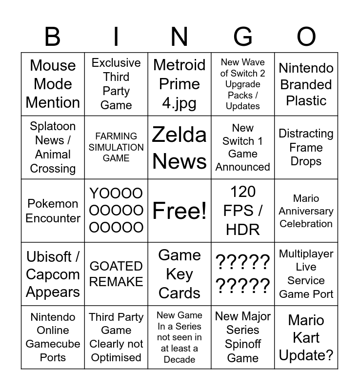 This bingo card has a free space and 24 words: GOATED REMAKE, Third Party Game Clearly not Optimised, Zelda News, Nintendo Online Gamecube Ports, Nintendo Branded Plastic, Mouse Mode Mention, Splatoon News / Animal Crossing, Exclusive Third Party Game, 120 FPS / HDR, Game Key Cards, New Switch 1 Game Announced, Pokemon Encounter, ????? ?????, Multiplayer Live Service Game Port, FARMING SIMULATION GAME, New Major Series Spinoff Game, Mario Anniversary Celebration, Metroid Prime 4.jpg, Distracting Frame Drops, YOOOO OOOOO OOOOO, Mario Kart Update?, Ubisoft / Capcom Appears, New Wave of Switch 2 Upgrade Packs / Updates and New Game In a Series not seen in at least a Decade.